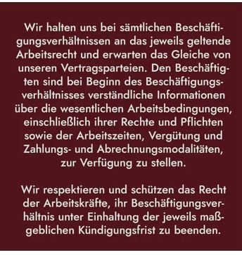 Wir möchten, dass alle Beteiligten sich wohl fühlen mit unserer Kleidung – von der Produktion bis zu deinem schlussendlichen Trageerlebnis. Wir achten streng und konsequent auf faire Arbeitsbedingungen in unserer gesamten Lieferkette – von der Verarbeitung der Stoffe bis zum Verkauf. Dabei orientieren wir uns an den folgenden acht Arbeitsstandards. Diese beruhen auf den Vorgaben der Fair Wear und richten sich nach den international anerkannten Arbeitsstandards der Internationalen Arbeitsorganisation (ILO).