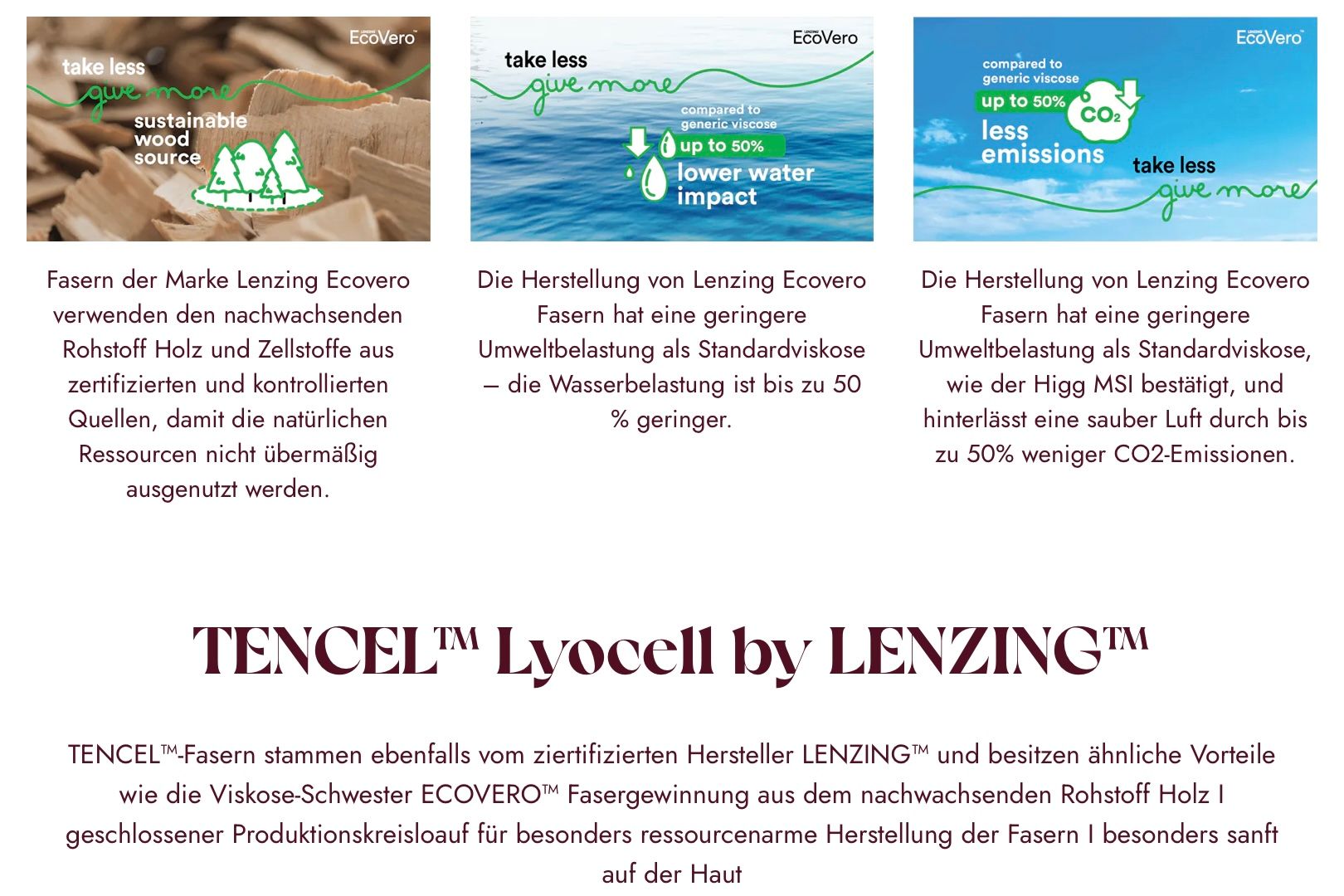 LENZING™ ECOVERO™ fibers are made from certified renewable wood sources, in an environmentally conscious manufacturing process that meets high environmental standards. LENZING™ ECOVERO™ fibers are tailored to a sustainable lifestyle and contribute to a clean environment.