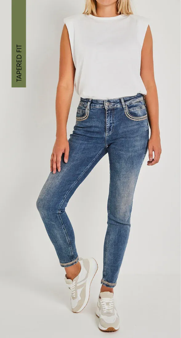 Tapered Fit ist eine Hose mit hoher Leibhöhe und das Hosenbein ist an den Oberschenkeln lockerer und verjüngt sich zu den Knöcheln hin.