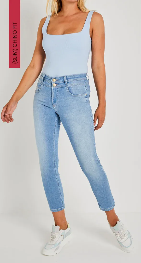 Die Slim Chino Fit ist eine Hose mit hohem Bund und das Hosenbein ist am Oberschenkel etwas weiter und läuft ab dem Knie schmal zu.