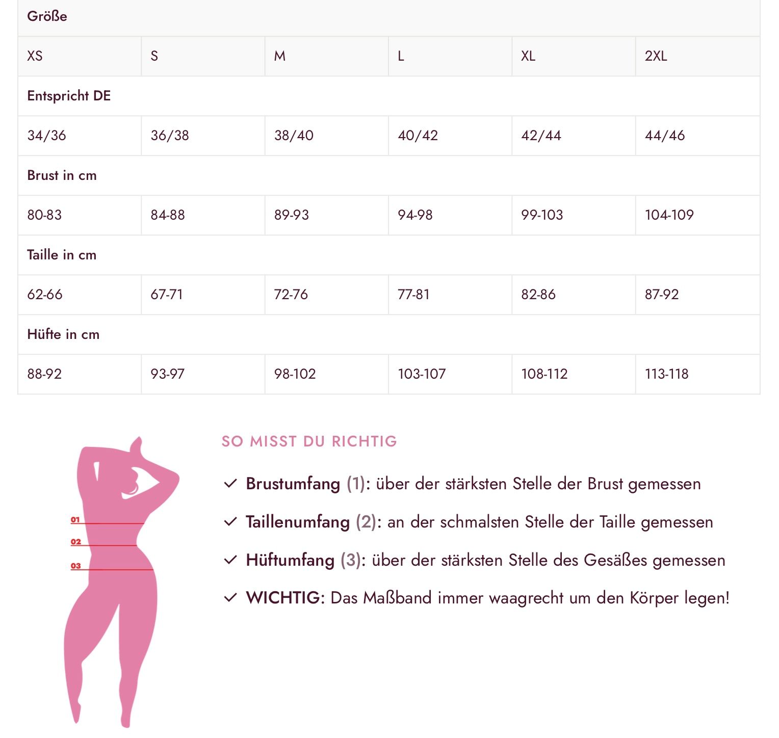 Die Maße unserer Artikel orientieren sich am deutschen Standardmaß, doch kann es durchaus vorkommen, dass manche Artikel aufgrund von unterschiedlichen Materialien und Schnitten in der Passform variieren können. Damit du stets die richtige Größe findest, stehen dir folgende Hilfen und Informationen zur Verfügung: